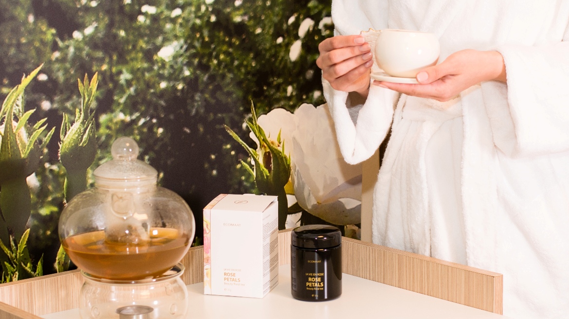 С дълбоко познаване на ползите от розата и най-съвременни технологии създадохме специален 100% био сертифициран чай за красота с венчелистчета от българска маслодайна роза, плодове от шипка и розово масло. Чаят Rose petals – La Vie en Rose е нашият най-продаван продукт в международния ни онлайн магазин. И това не е случайно – цени се заради богатото съдържание на флавоноиди, витамини и микроелементи. Една благоуханна чаша чай Rose petals на ден помага за укрепване на организма и е перфектно допълнение към ежедневната грижа за красотата и младостта на кожата.